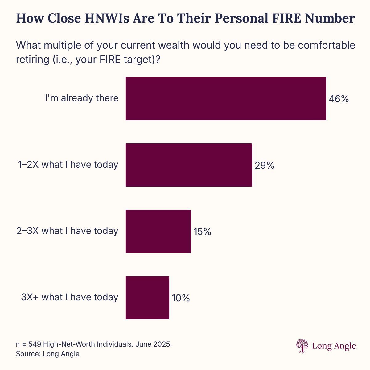A Long Angle poll shows that over half of HNW respondents say they still need additional multiples of their current wealth to feel comfortable retiring. And for many, the goalposts keep moving.