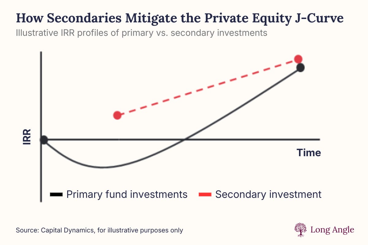 With secondaries, investors can skip much of the early cash drag (the “J-curve”) that is common in traditional private equity before value creation begins.