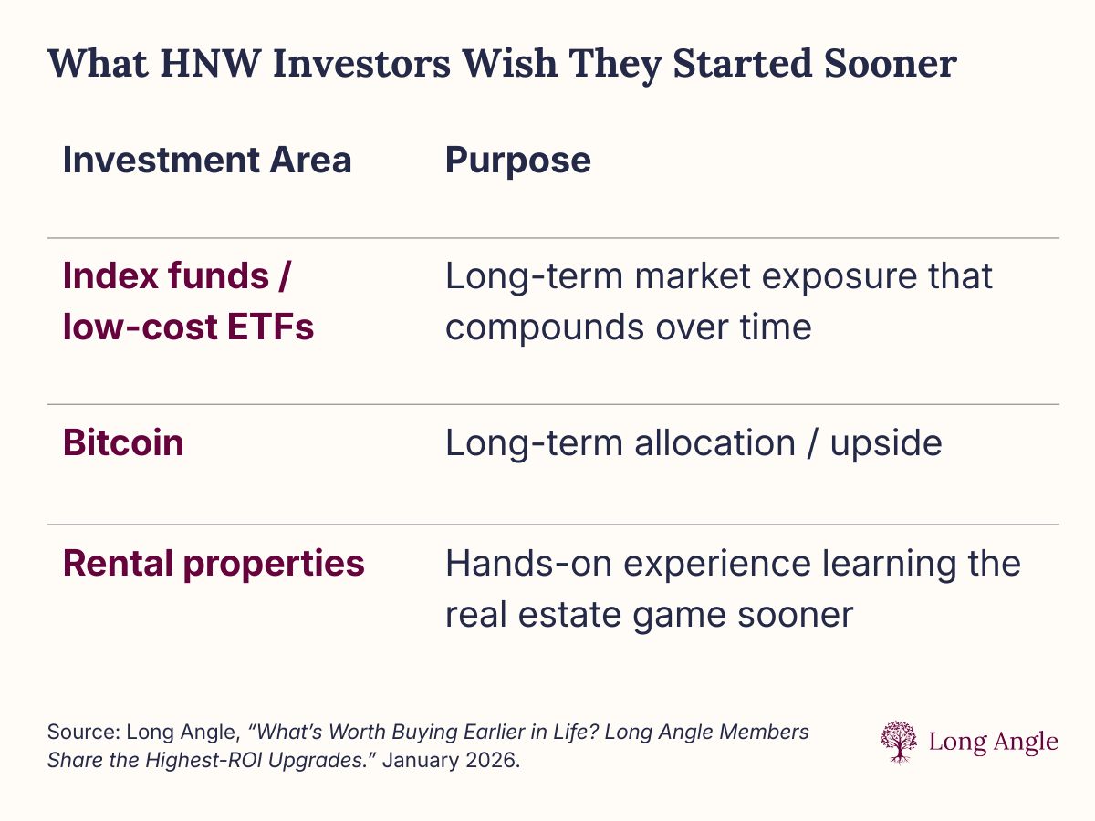 Others pointed to early participation in Bitcoin or gaining hands-on experience with investing in rental properties.