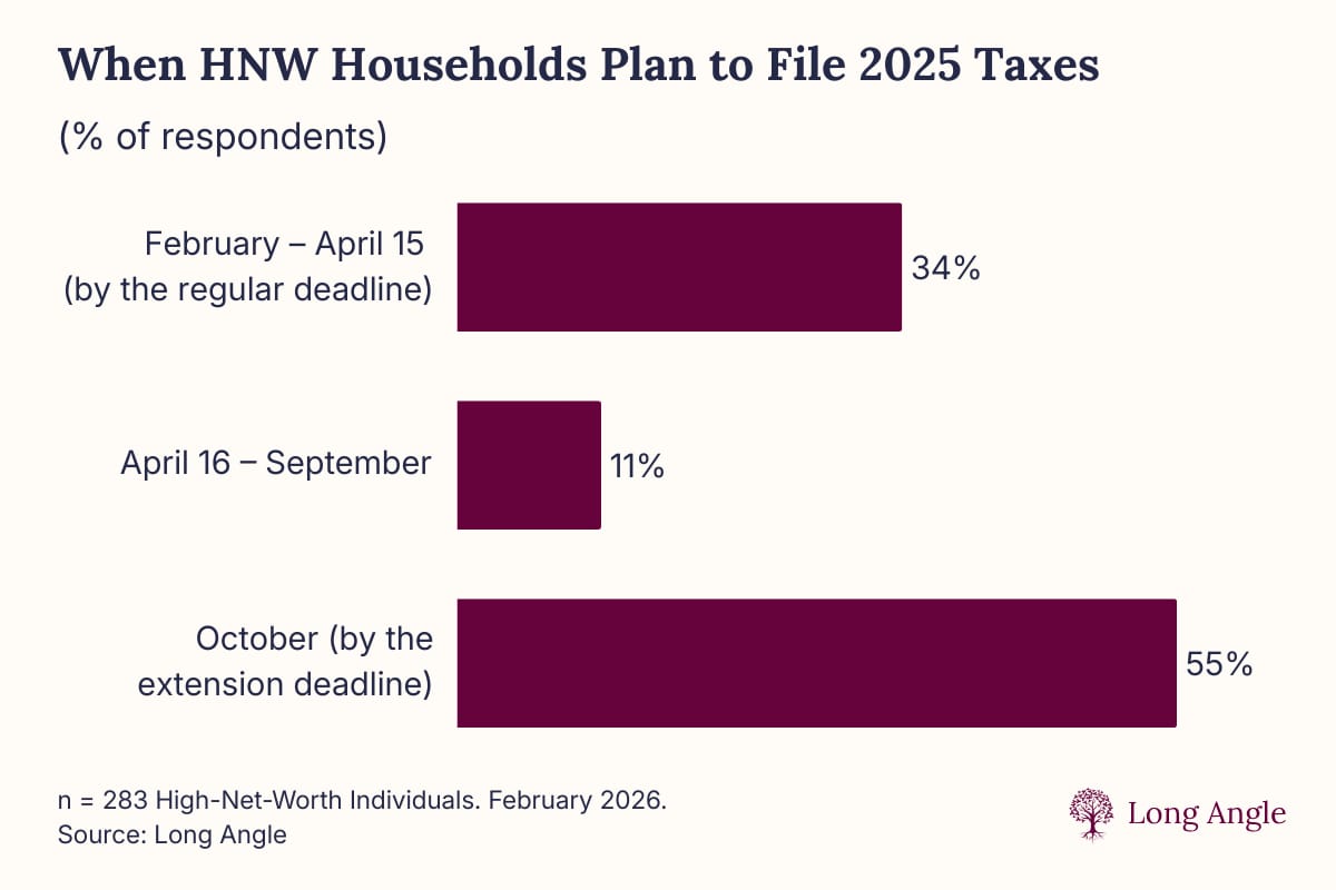 We polled 280 high-net-worth Long Angle members asking when they plan to handle tax filing.